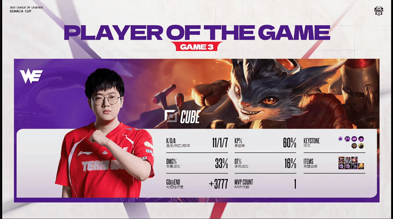 虎撲12月18日訊 在剛剛結(jié)束的UP對(duì)陣WE的BO3比賽中,Cube蘭博打出11/1/7戰(zhàn)績(jī),對(duì)P第斬獲WE對(duì)陣UP第三局MVP