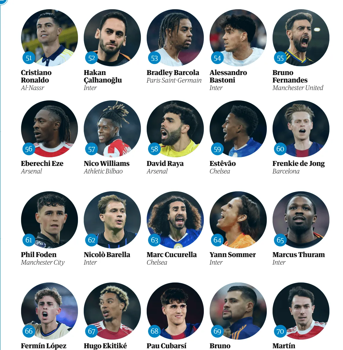 [流言板]衛(wèi)報(bào)2025百大球星51-70:C羅51、板衛(wèi)報(bào)百B費(fèi)55福登61庫(kù)巴西68由虎撲足球資訊 發(fā)表在國(guó)際足球資訊 https://bbs.hupu.com/482