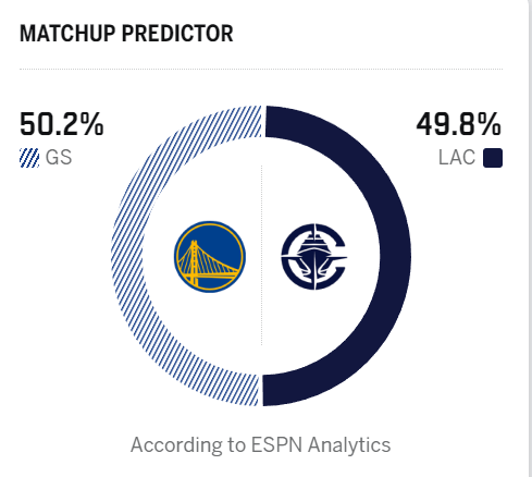 賽前,日比美媒ESPN預測本場比賽,賽勇士勝勝率勇士勝率為50.2%,快船快船勝率為49.8%。