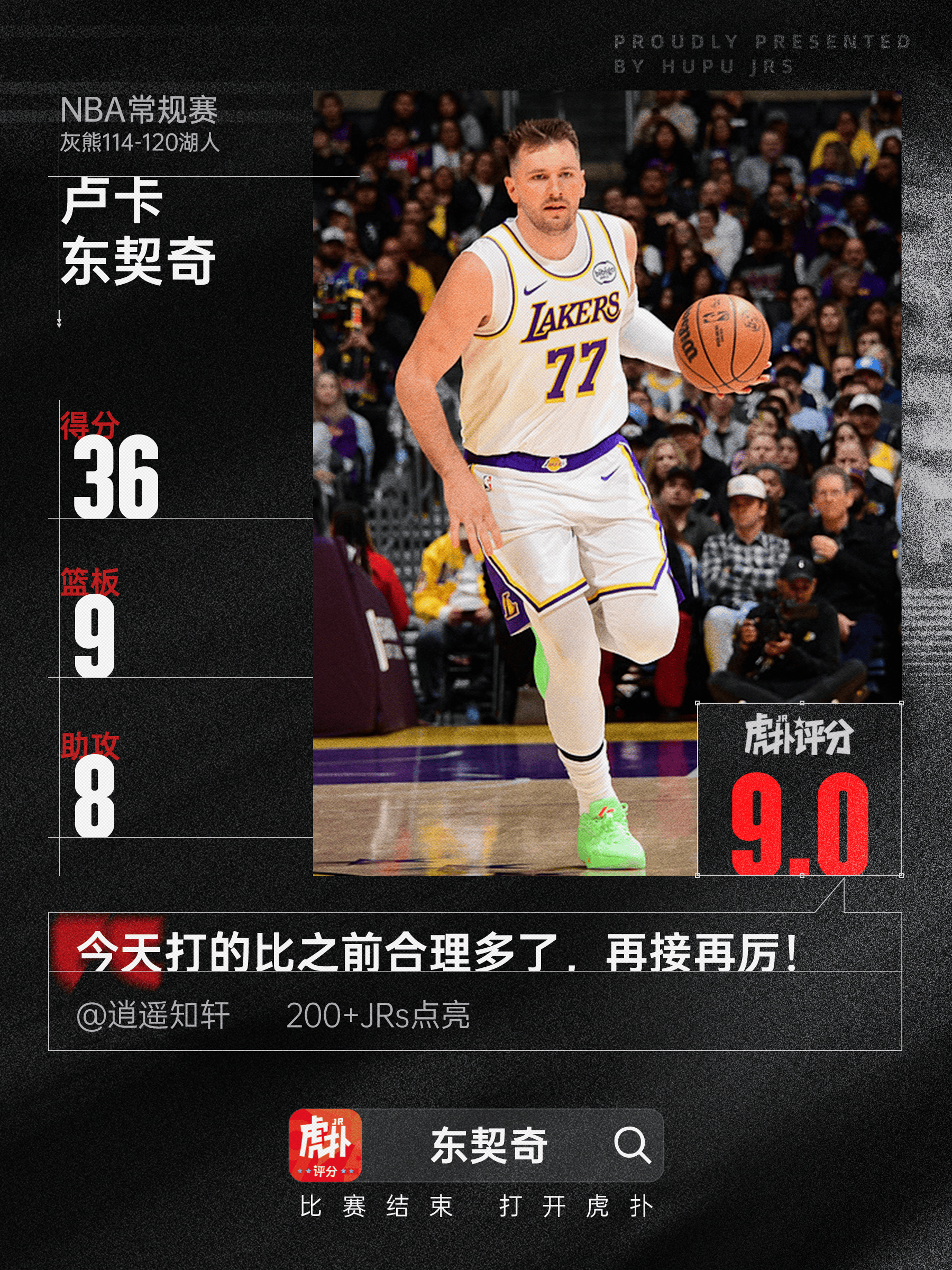 本場比賽,下分湖人球員盧卡-東契奇出戰(zhàn)38分鐘,籃板20投10中,封蓋其中三分球10投4中,東契罰球13投12中,奇全得到36分9籃板8助攻1封蓋。場投