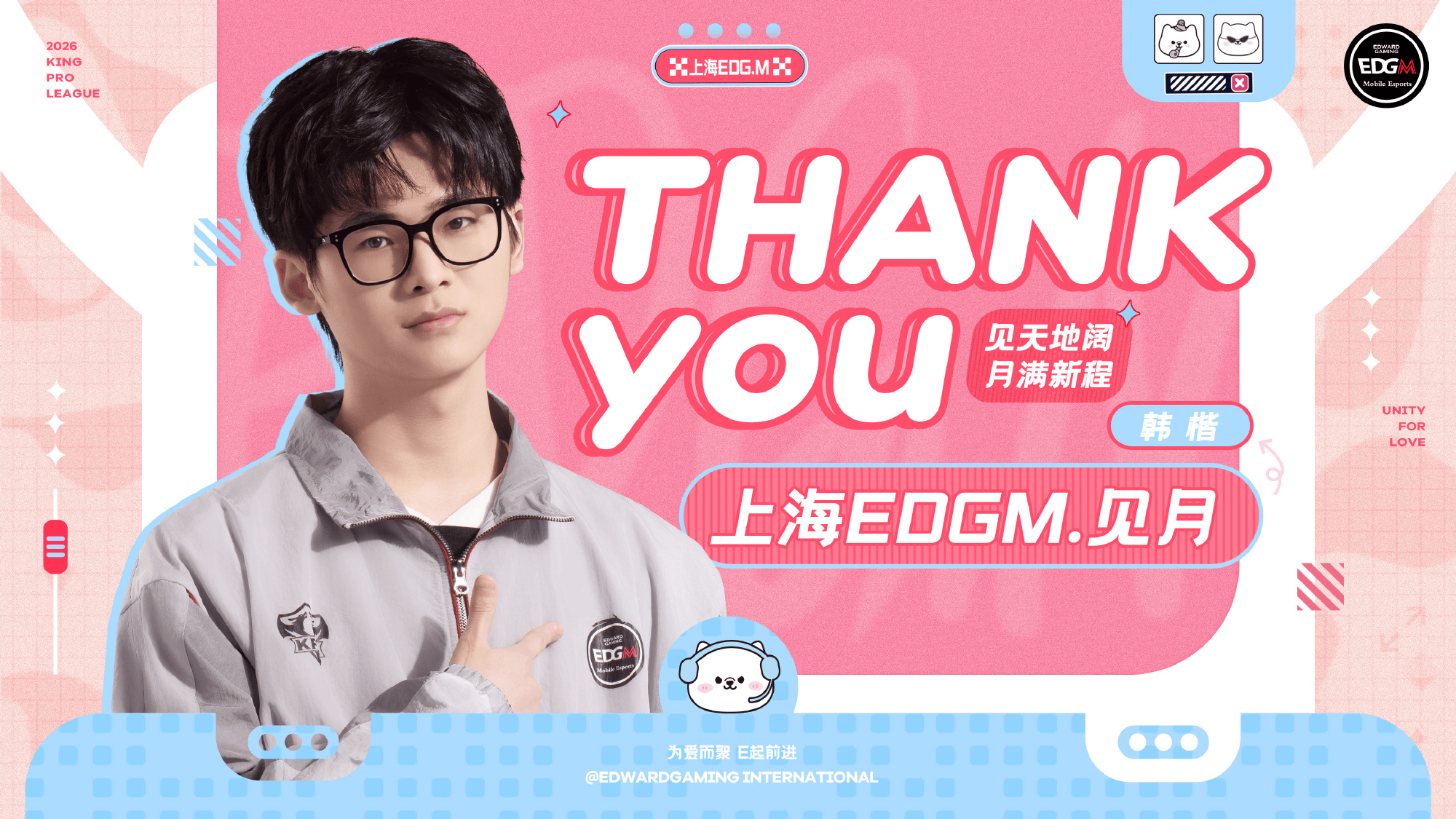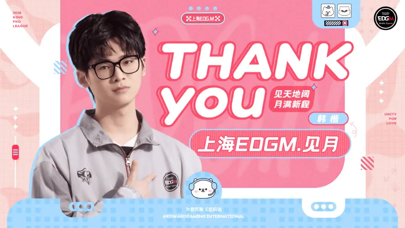 在充分尊重選手個人意愿的前提下,經(jīng)過三方充分溝通與友好協(xié)商,原EDG電子競技俱樂部王者榮耀分部選手上海EDGM.見月(韓楷)正式退役。