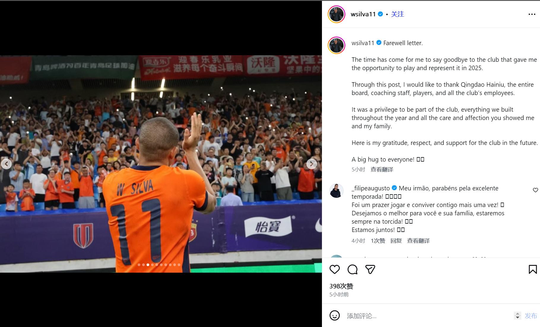 虎撲12月28日訊 青島海牛外援席爾瓦今日更新社媒,向青島海牛俱樂(lè)部告別:
