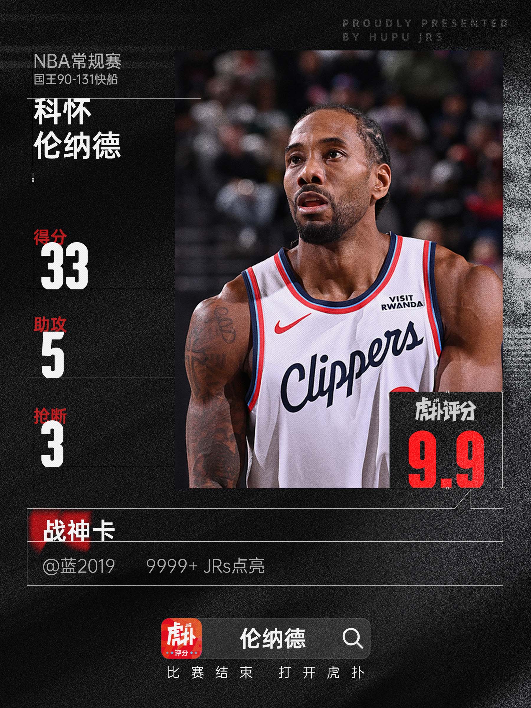 [流言板]倫納德全場19投11中,板倫板助三分9中5得到33分5籃板5助攻3搶斷1帽由虎撲籃球資訊 發(fā)表在籃球資訊 https://bbs.hupu.com/502