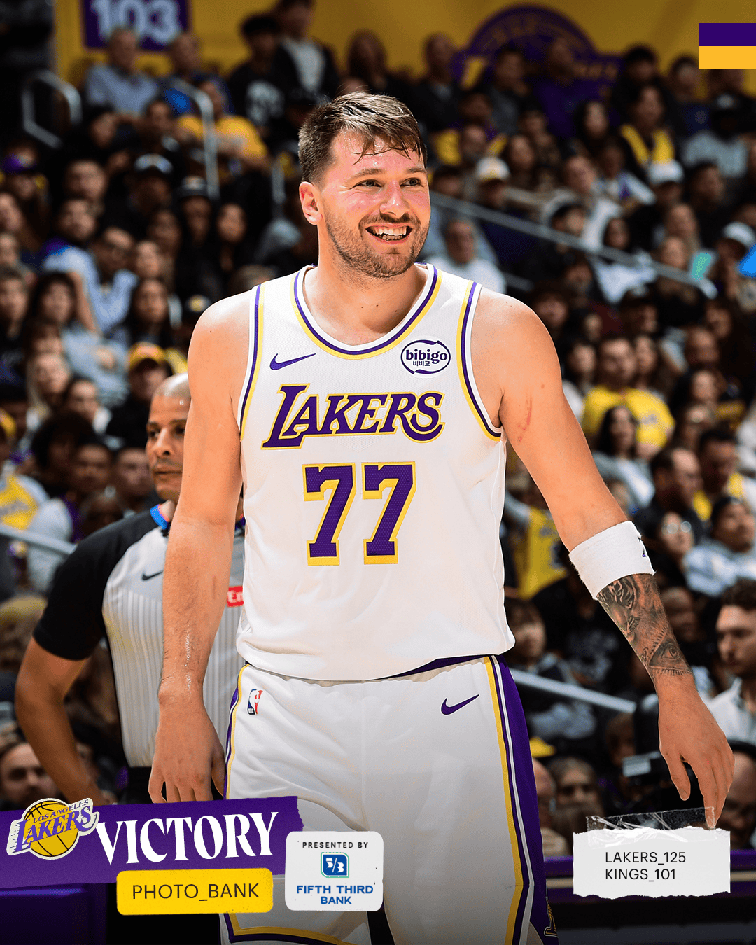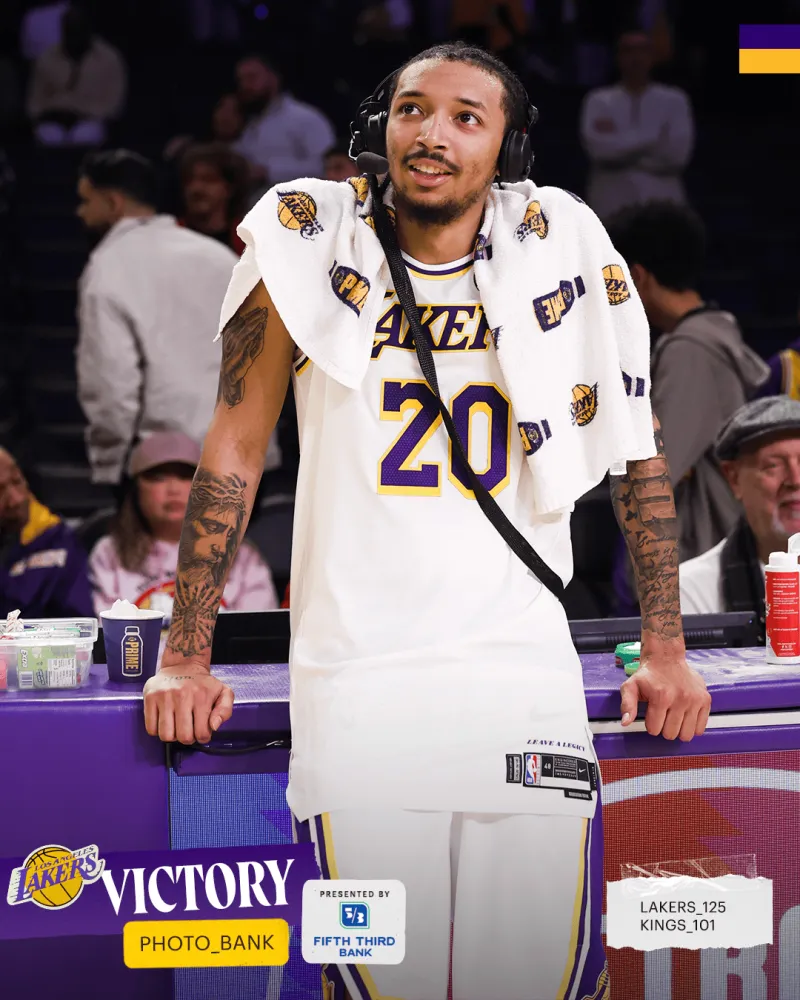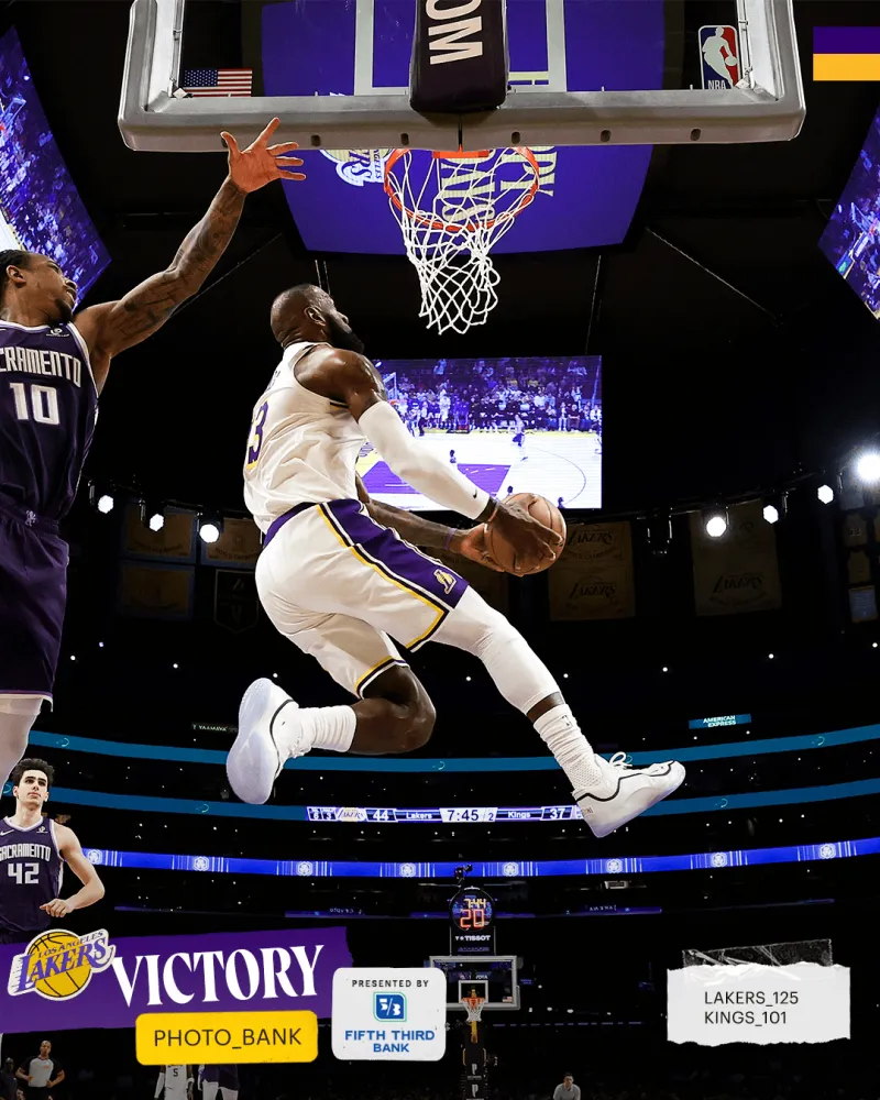 賽后,湖人官方曬出今日球員的賽場照慶祝勝利:詹姆斯、東契奇、尼克-史密斯等出鏡。
