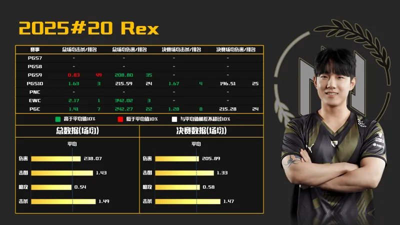 Rex的數據結構和Heather比較相似,擊殺、擊倒數據相當亮眼:總場均擊殺1.49(#2),決賽場均擊殺1.47,總場均擊倒1.43(#3),決賽場均擊倒1.33,這兩項數據完全可以和榜首的幾位選手去一爭高下,而且Rex在PGS10和PGC上也都有著出色表現。