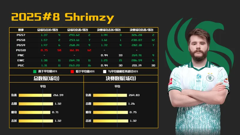 和他的隊友TGLTN一樣,Shrimzy今年打出了非常不錯的數據,在助攻、擊倒等數據上比TGLTN還要略勝一籌,各項均位于前列:總場均擊殺1.32(#8),決賽場均擊殺1.32(#9),總場均傷害261.59(#8),決賽場均傷害264.83(#9),總場均助攻0.71(#9),決賽場均助攻0.75(#7),總場均擊倒1.26(#10)。