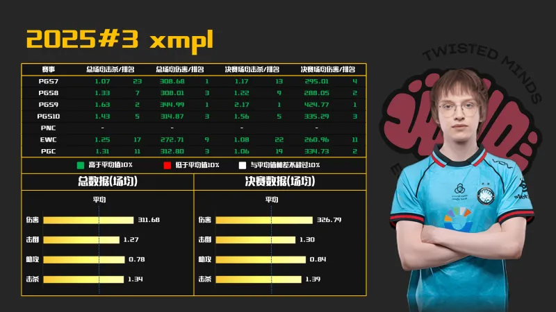 xmpl的劣勢在于他在EWC和PGC上的表現雖然可以說差強人意,但與他的競爭者相比還是落了下風,尤其是兩次決賽的場均擊殺分別為1.08(#22)和1.06(#19),未能打出應有的水準。因此將xmpl排在了top3的位置。