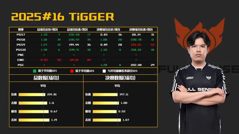TiGGER的全年的總數據不錯,尤其是場均擊殺為1.19(#14),場均助攻為0.67(#13),而且在PGS10和PGC都有亮眼表現,他在PGS10上的總場均擊殺為1.40(#6),決賽場均擊殺為1.33(#8),在PGC決賽階段的場均擊殺為1.28(#8)。