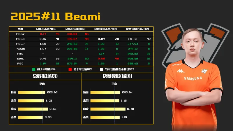 但是由于小組賽的糟糕數據,他的全年總場均擊殺僅有0.98(#36),是top20選手中最低的,經綜合考慮,將Beami放在了top11的位置。