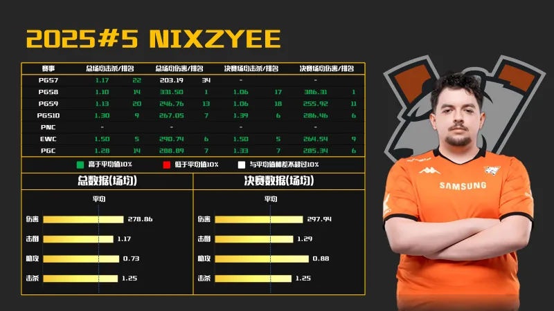 從各個賽事的數據可以看出,NIXZYEE的穩(wěn)定性同樣高得驚人,所有賽事的場均擊殺都高于平均值10%以上,他的數據中最突出的還是傷害和助攻兩項:總場均傷害278.86(#5),總場均助攻0.73(#5);在決賽階段這兩項數據則更加優(yōu)秀:決賽場均傷害297.94(#3),決賽場均助攻0.88(#1),毫無疑問,NIXZYEE能讓隊友更加容易地去獲得擊殺。在重要賽事上NIXZYEE的表現也尤為出色,在EWC和PGC的決賽中分別打出了1.50(#5)和1.33(#7)的場均擊殺。