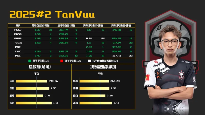 TanVuu的數據同樣也存在不足,決賽階段的數據相比小組賽有不小的下滑,而且將PNC的數據剔除后,他的決賽場均擊殺則只剩1.14,對于這個名次的選手來說有失水準。因此綜合考慮將TanVuu給到了top2的排名。