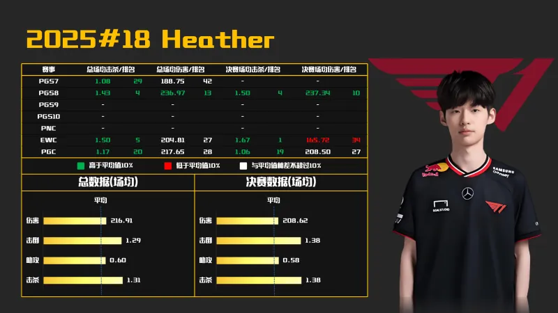 Heather的數據非常出色,特別是擊殺、擊倒兩項數據,他的總場均擊殺1.31(#10),決賽場均擊殺1.38(#5),總場均擊倒1.29(#6),決賽場均擊倒1.38(#3),他在PGS8和EWC上也打出了非常出色的數據:PGS8的總場均擊殺為1.43(#4),決賽場均擊殺為1.50(#4),EWC的總場均擊殺為1.50(#5),決賽場均擊殺為1.67(#1)。