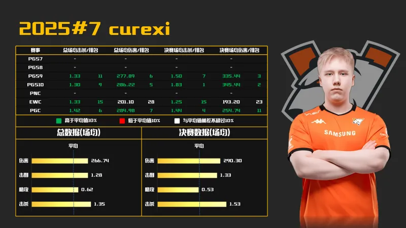 限制curexi排名前進的主要原因是他的參賽場次較少,由于缺席了PGS7和PGS8,他全年只參加了四個賽事,樣本數量相對較少,這使得他止步于top7。