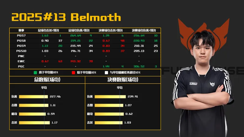 Belmoth有著還不錯的全年數據:總場均擊殺1.17(#15),決賽場均擊殺1.03(#25),總場均傷害227.46(#21),決賽場均傷害239.91(#13),總場均助攻0.59(#32),決賽場均助攻0.62(#18),總場均擊倒1.11(#19),決賽場均擊倒1.07(#21)。單憑這些數據還無法讓他當選top13,真正讓他坐穩(wěn)這個排名的是兩個賽事的數據,一個是PGS7,在該賽事中他的總場均擊殺和決賽場均擊殺分別為1.63(#1)和1.39(#6),另一個則是PGC,他在決賽上打出了1.44(#3)的場均擊殺和306.52(#3)的場均傷害。