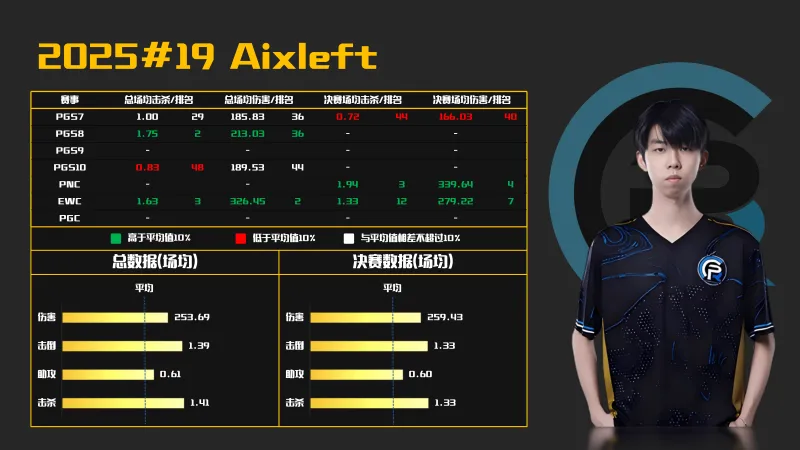 Aixleft在今年的賽事中打出了優(yōu)秀的數據,他的總場均擊殺1.41(#3),決賽場均擊殺1.33(#8),總場均傷害253.69(#11),決賽場均傷害259.43(#10),總場均擊倒1.39(#4),決賽場均擊倒1.33(#5),他在PNC上的場均擊殺為1.94(#3),場均傷害為339.64(#4),在EWC上的總場均擊殺為1.63(#3),場均傷害為326.45(#2)。