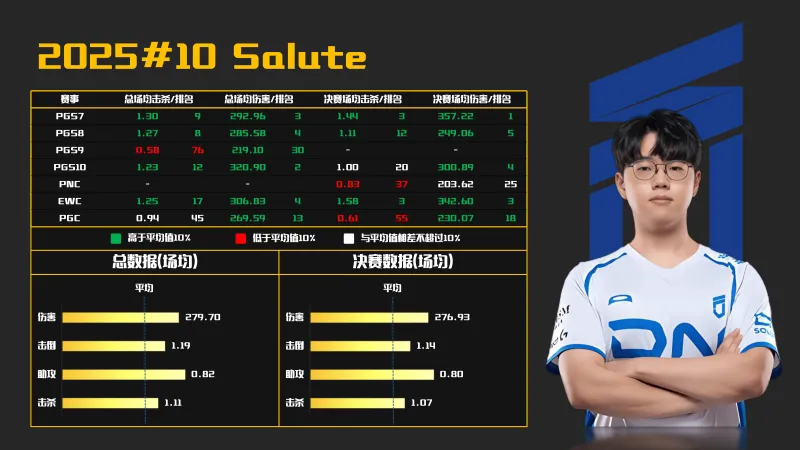 盡管比去年有所下滑,但Salute還是獲得了top10的排名,他的數據優(yōu)劣勢都可謂非常明顯,優(yōu)勢在于他的傷害和助攻數據非常突出:總場均傷害279.70(#4),決賽場均傷害276.93(#5),總場均助攻0.82(#1),決賽場均助攻0.80(#4),這幾項數據完全不輸給排行榜上的一些高位選手。