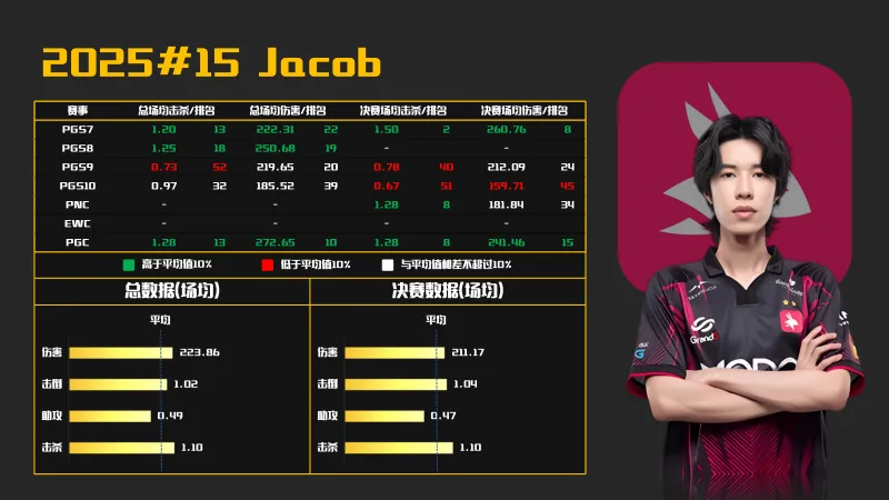 Jacob的總場均擊殺為1.10(#23),決賽場均擊殺1.06(#17),PGS7決賽是Jacob今年表現最佳的賽事,場均擊殺1.50(#2),場均傷害260.76(#8),他在PNC和PGC上同樣也有不錯的表現,場均擊殺都為1.28(#8)。