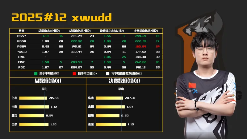 xwudd和Lilghost是今年僅有的兩個打滿7次決賽的選手,也是僅有的兩個總比賽場次超過200場的選手,這意味著相比于場次較少的選手,他的數據有著更高的含金量。在年初的PGS7的決賽上,xwudd打出了出色的表現,以1.56(#1)的場均擊殺幫助隊伍奪得冠軍,在EWC上,xwudd的整體數據更加亮眼:總場均擊殺和決賽場均擊殺均為1.50(#5),總場均傷害和決賽場均傷害分別為283.53(#7)和262.02(#10)。同時,xwudd的發(fā)揮也較為穩(wěn)定,全年未出現表現特別糟糕的情況。