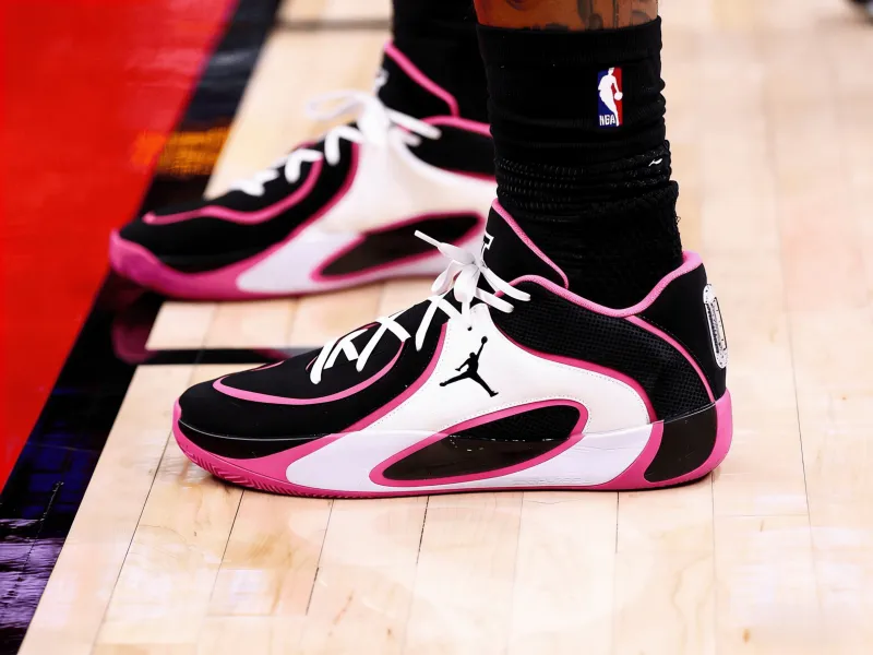 比賽之外,班凱羅上腳黑粉色Jordan Tatum4。