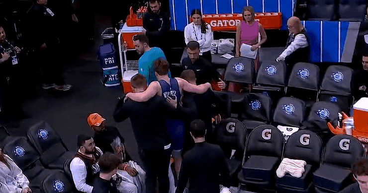 第二節(jié)比賽,崴腳克尼普爾防守落地崴腳,隨后隨后被攙扶離場返回更衣室。被攙