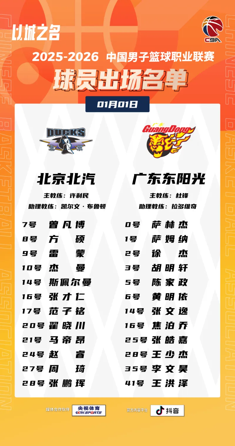 虎撲01月01日訊 今日CBA常規(guī)賽,北京對陣廣東的缺席大名單已經(jīng)公布。