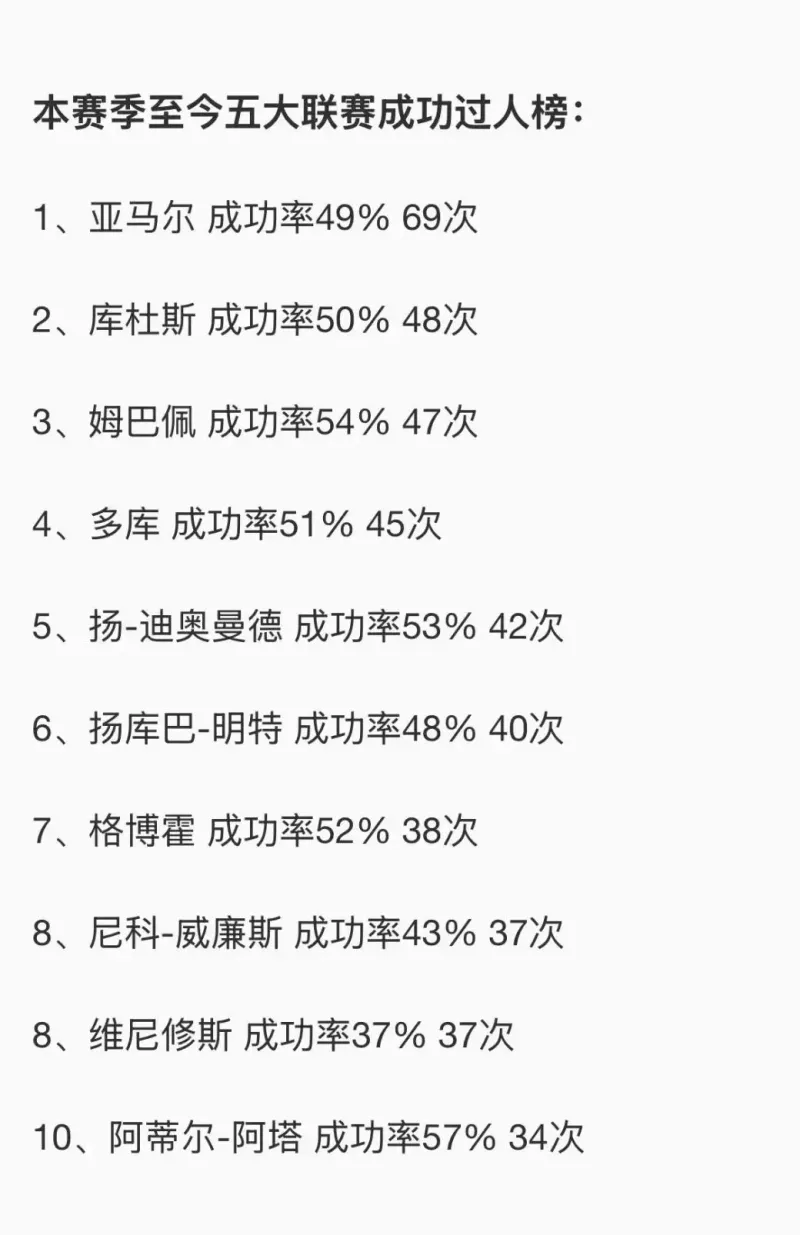 五大聯(lián)賽至今成功過人榜:維尼修斯過人率37%,亞馬爾過人率49%,多庫過人率51%,姆巴佩過人率54%