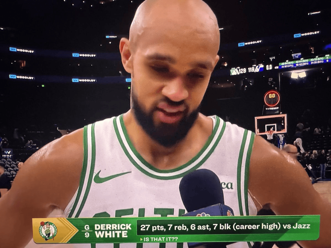 全場(chǎng)比賽,凱爾特人后衛(wèi)德里克-懷特首發(fā)出戰(zhàn)36分鐘,16投8中,三分球10投2中,罰球9罰9中得到27分7籃板6助攻7封蓋。