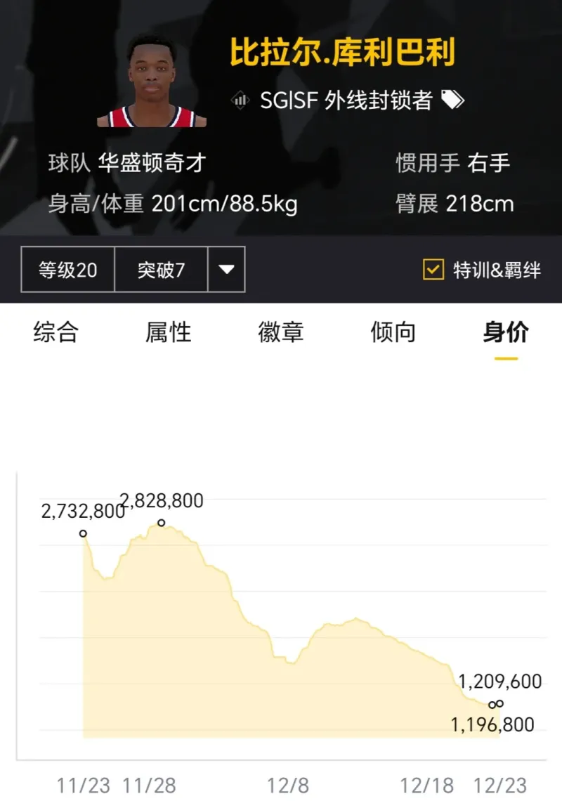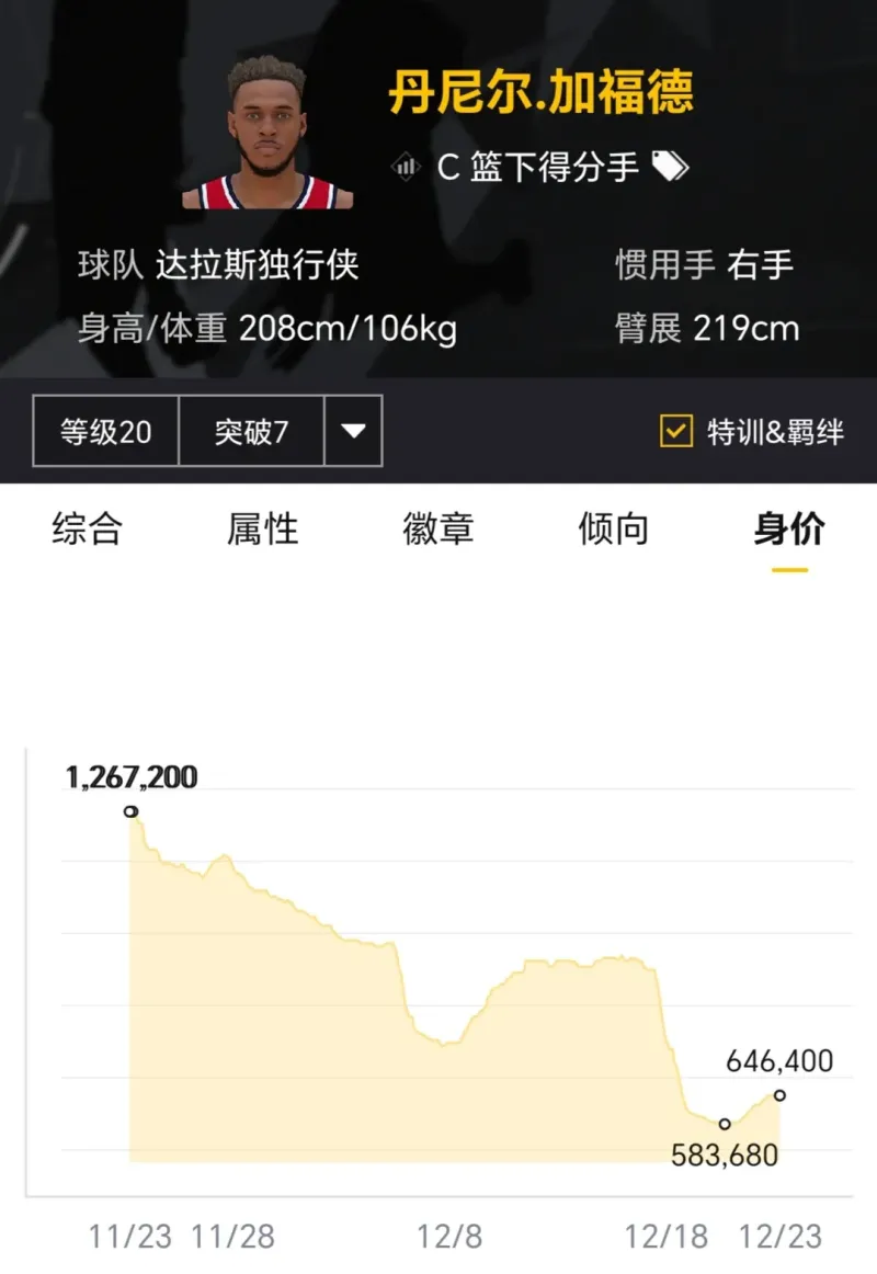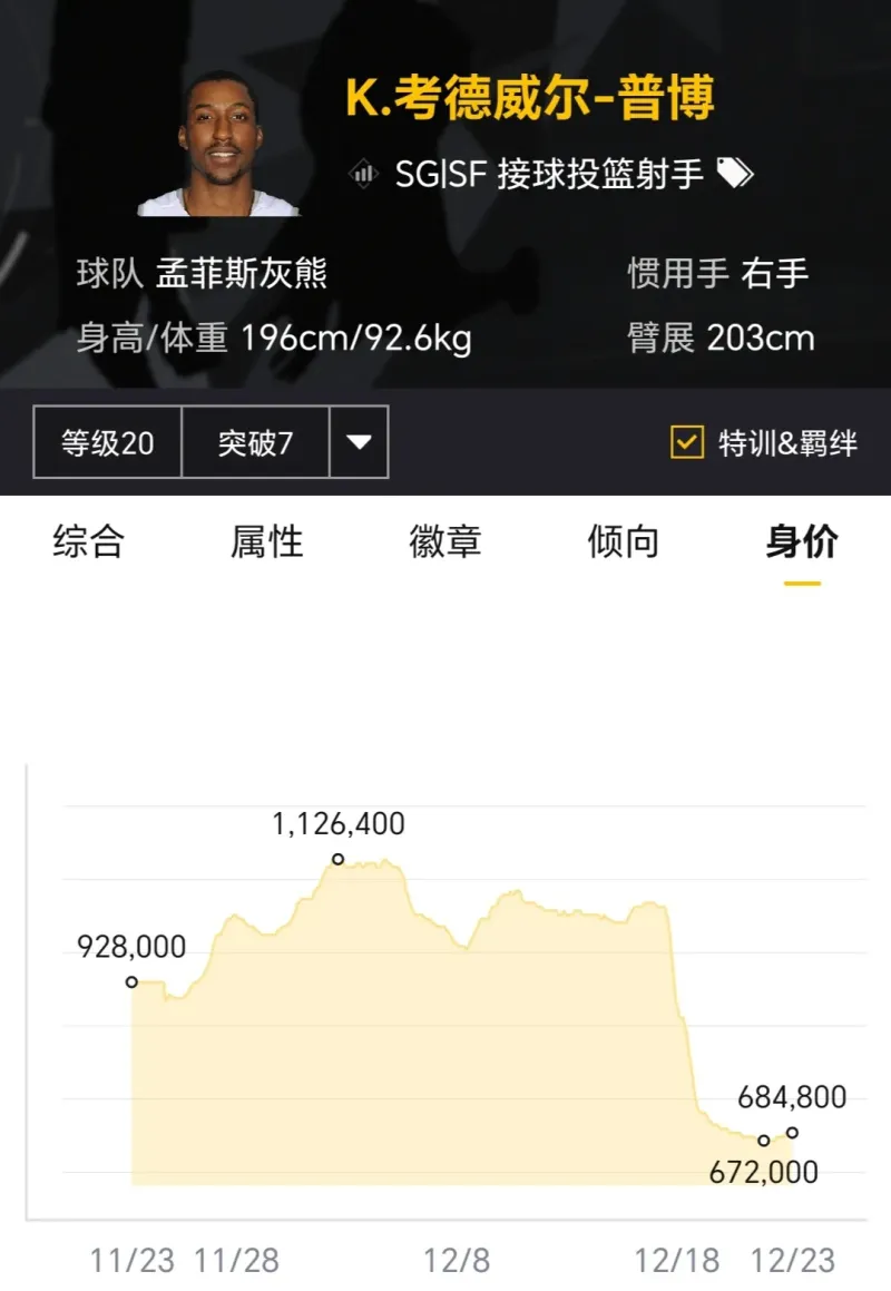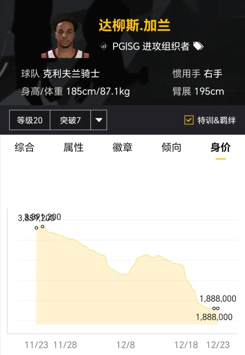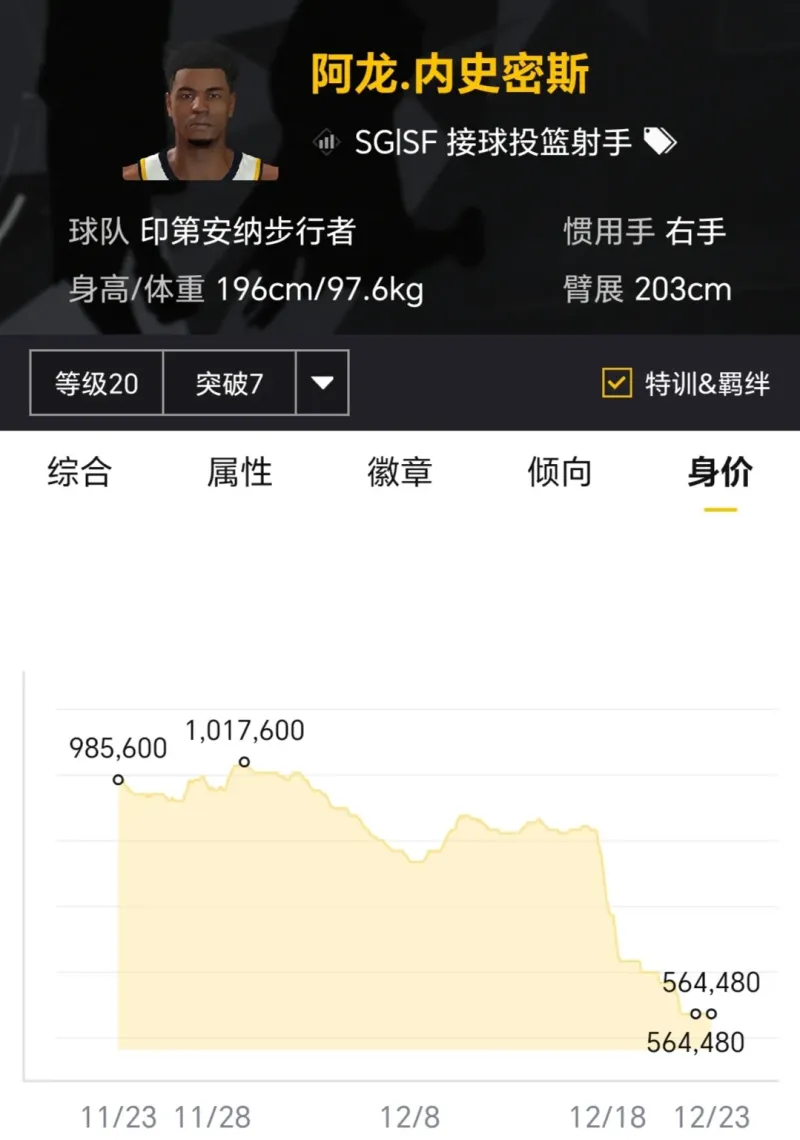 賽季開(kāi)始時(shí)滿突身價(jià)1500萬(wàn)左右,如今滿突身價(jià)600多萬(wàn),身價(jià)縮水了一半還多,主要原因是現(xiàn)實(shí)中投射狀態(tài)糟糕,最新正代更新三分球數(shù)值遭到大幅削弱,急需后續(xù)投射回暖。