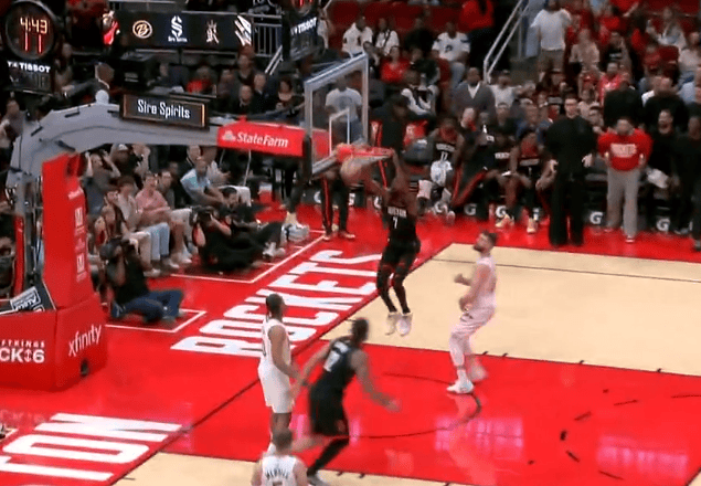 比賽的已砍第三節(jié),杜蘭特一投一扣已砍下29分,下分火箭領(lǐng)先到23分打停騎士。火箭