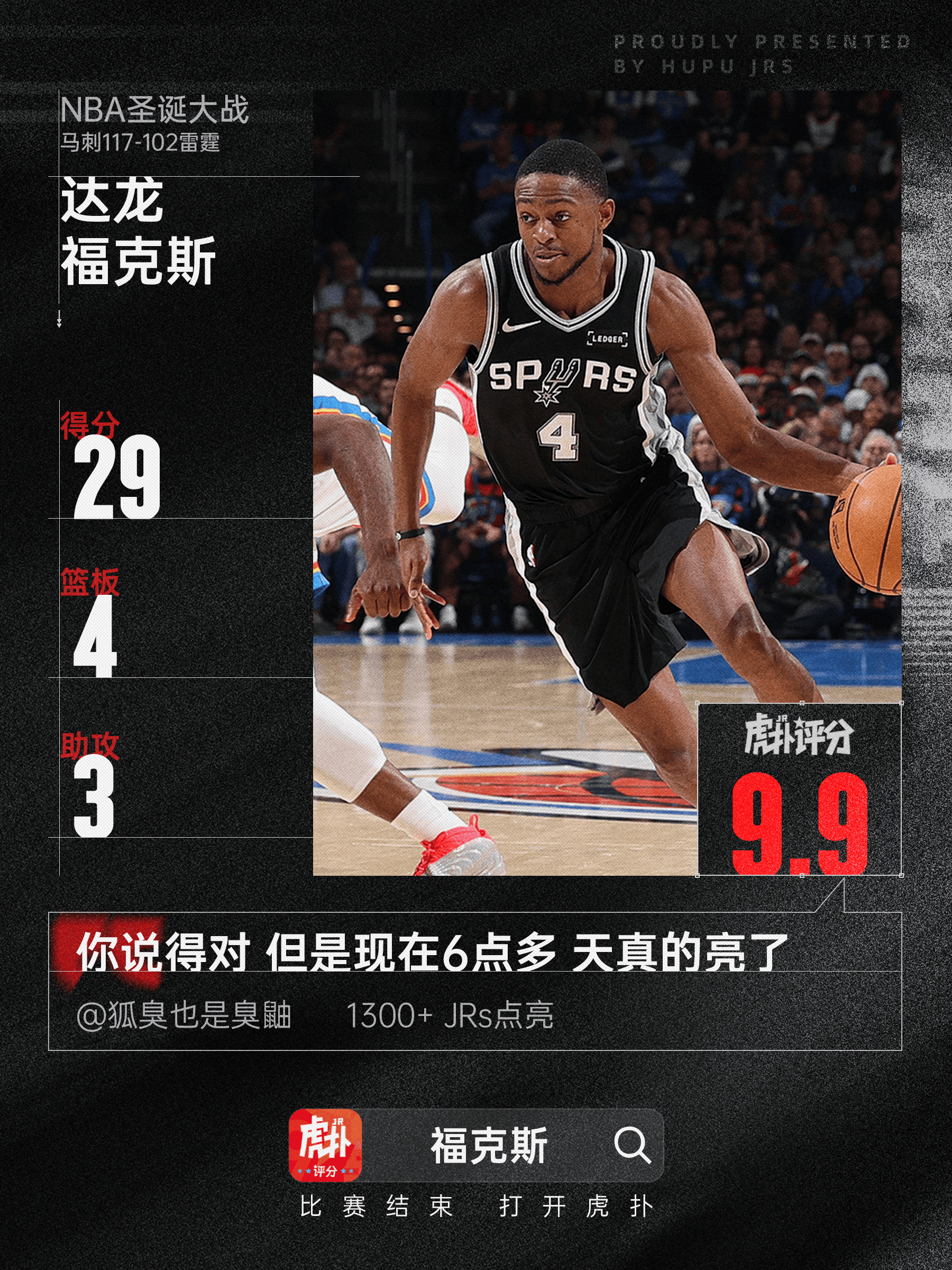 本場(chǎng)比賽,助攻馬刺球員達(dá)龍-福克斯出戰(zhàn)32分鐘,搶斷19投12中,發(fā)揮福克封蓋其中三分球4投3中,出色場(chǎng)砍罰球2投2中,斯全得到29分4籃板3助攻1搶斷1封蓋。下分