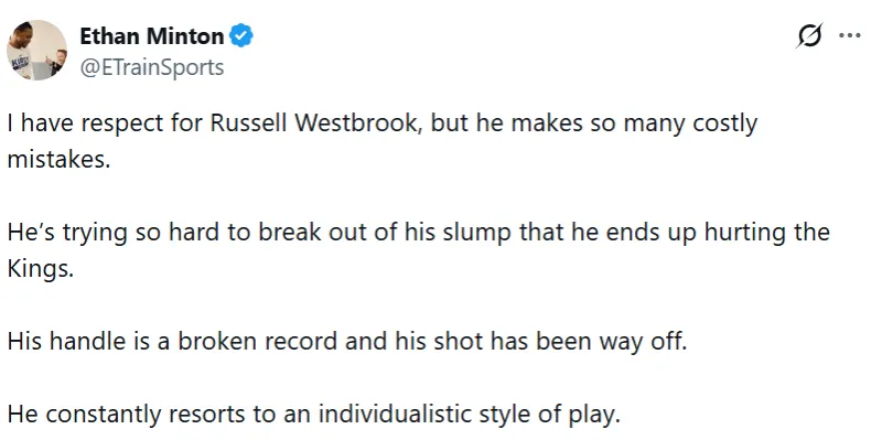 賽后,國王博主Ethan Minton更推,對威斯布魯克近期的表現(xiàn)進行了點評:
