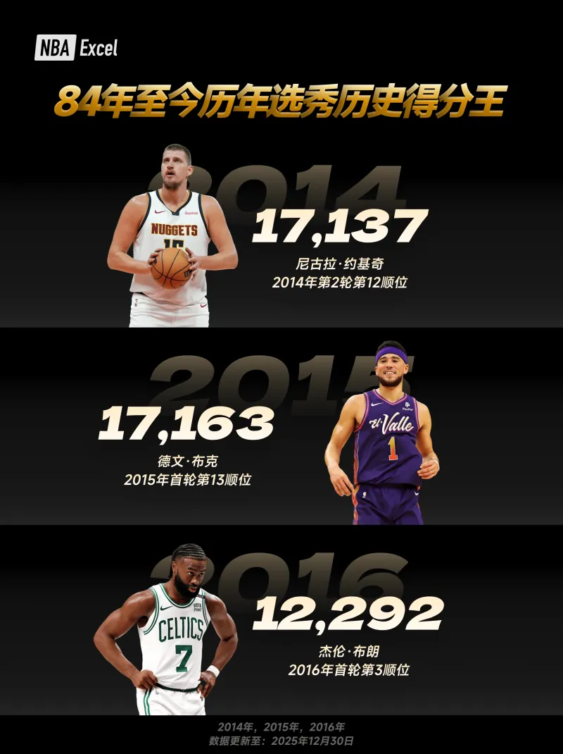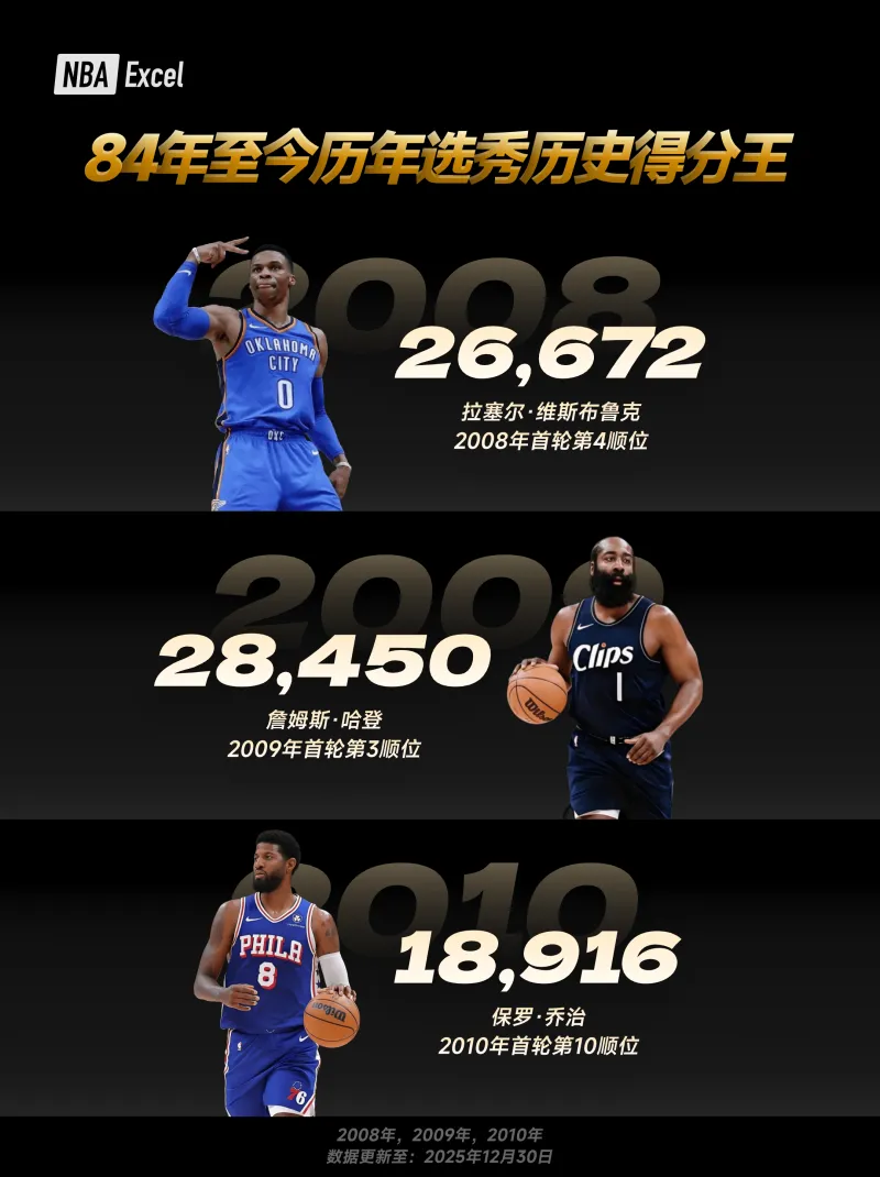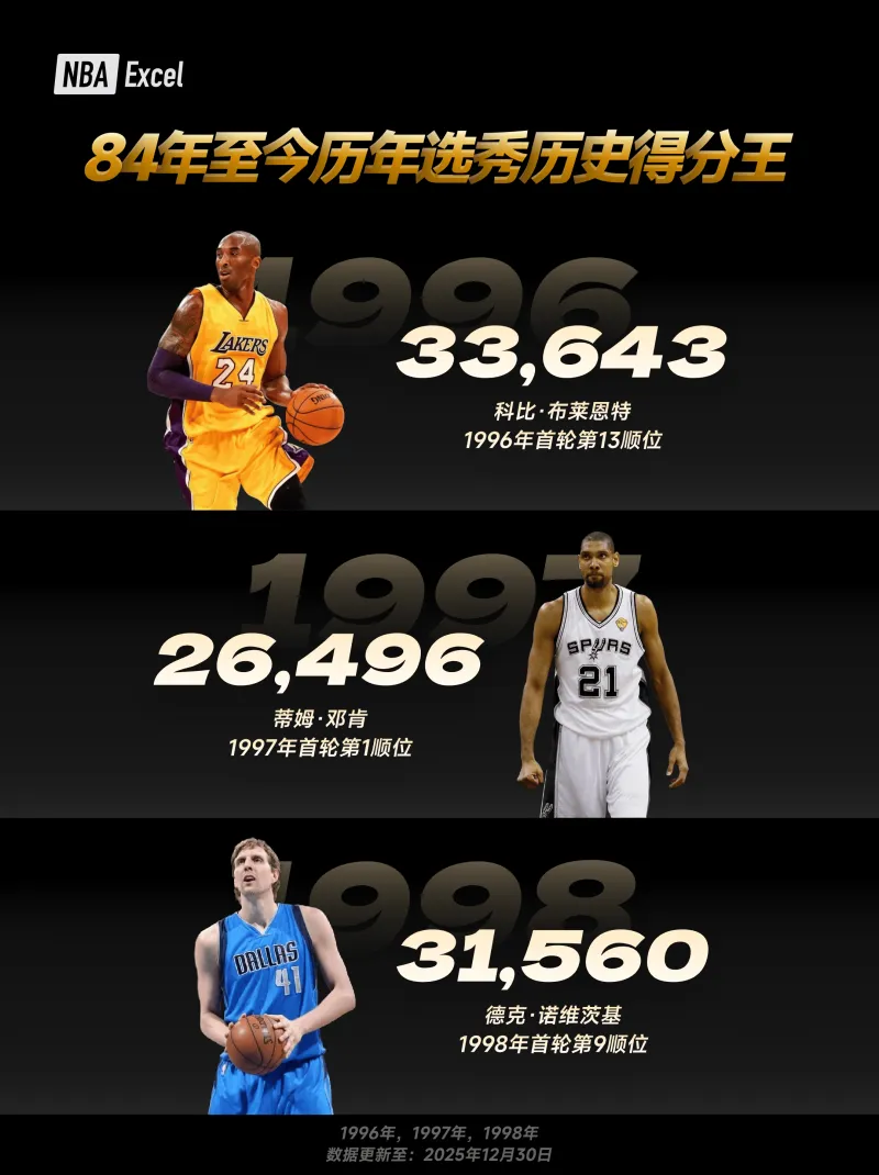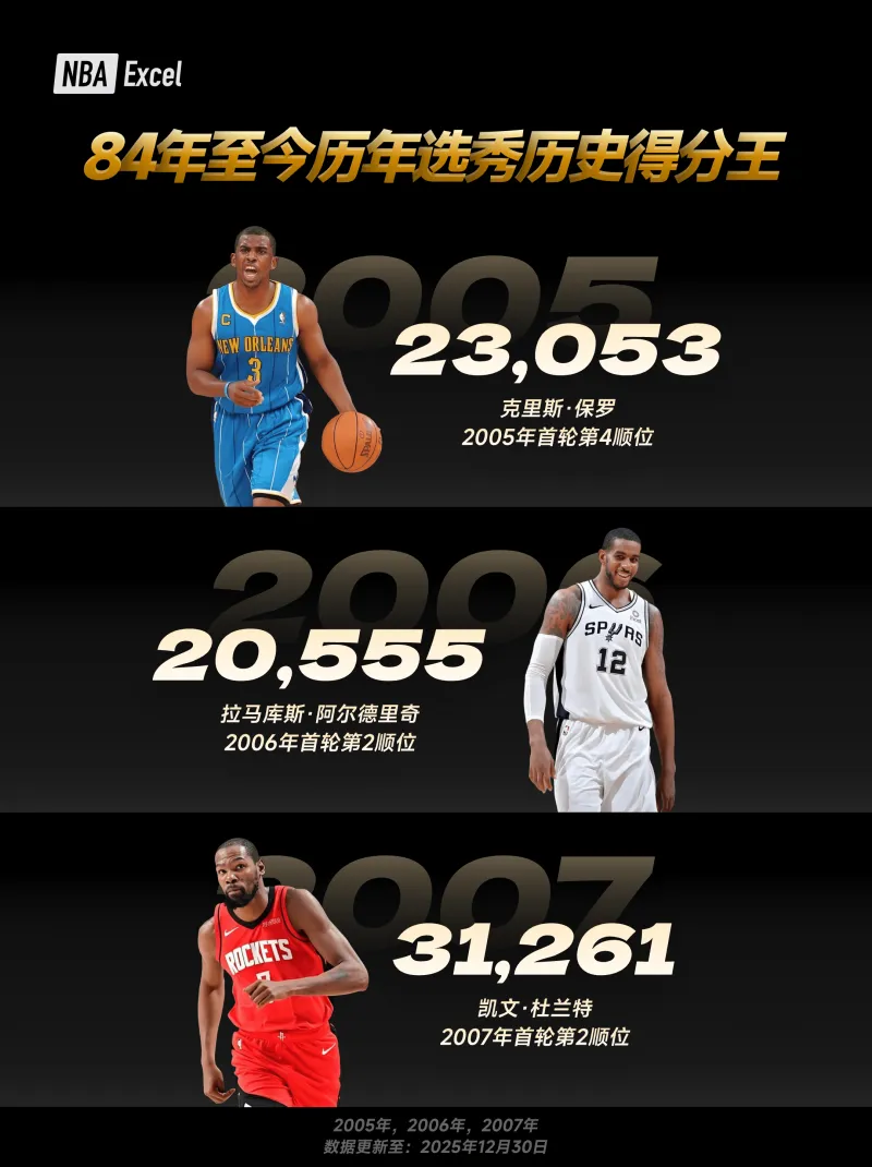以下為各屆選秀球員 NBA 常規(guī)賽生涯總得分最高者(數(shù)據(jù)截至當前賽季,近年新秀仍處于生涯早期,得分將持續(xù)變化)