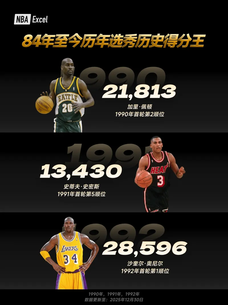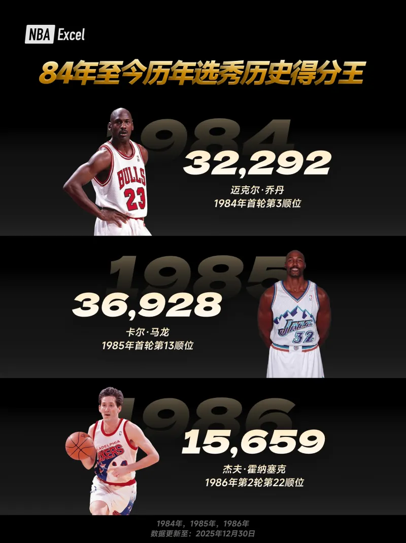 從1984年開始,NBA選秀不再只是球隊補強的起點,而逐漸成為塑造聯(lián)盟歷史的源頭。每一屆選秀中,總會有人憑借漫長而穩(wěn)定的職業(yè)生涯,在同屆球員中積累下最高的總得分,成為這一屆真正“打到最后”的代表。這些選秀得分王,有的是狀元天賦兌現(xiàn),有的是低順位逆襲,他們的共同點只有一個——時間、實力與健康的長期疊加?;乜?4年至今的歷屆選秀歷史得分王,其實也是一部濃縮的 NBA 發(fā)展史。