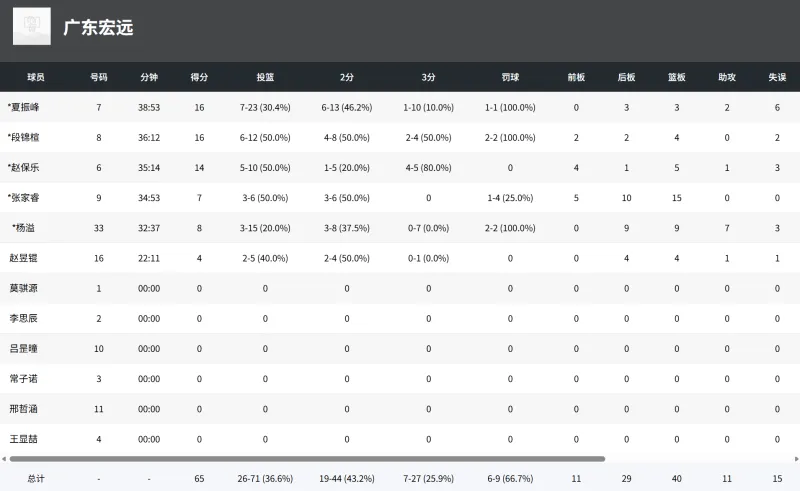廣東:夏振峰16分、賽楊思毅段錦楦16分、分上趙保樂(lè)14分。男籃
