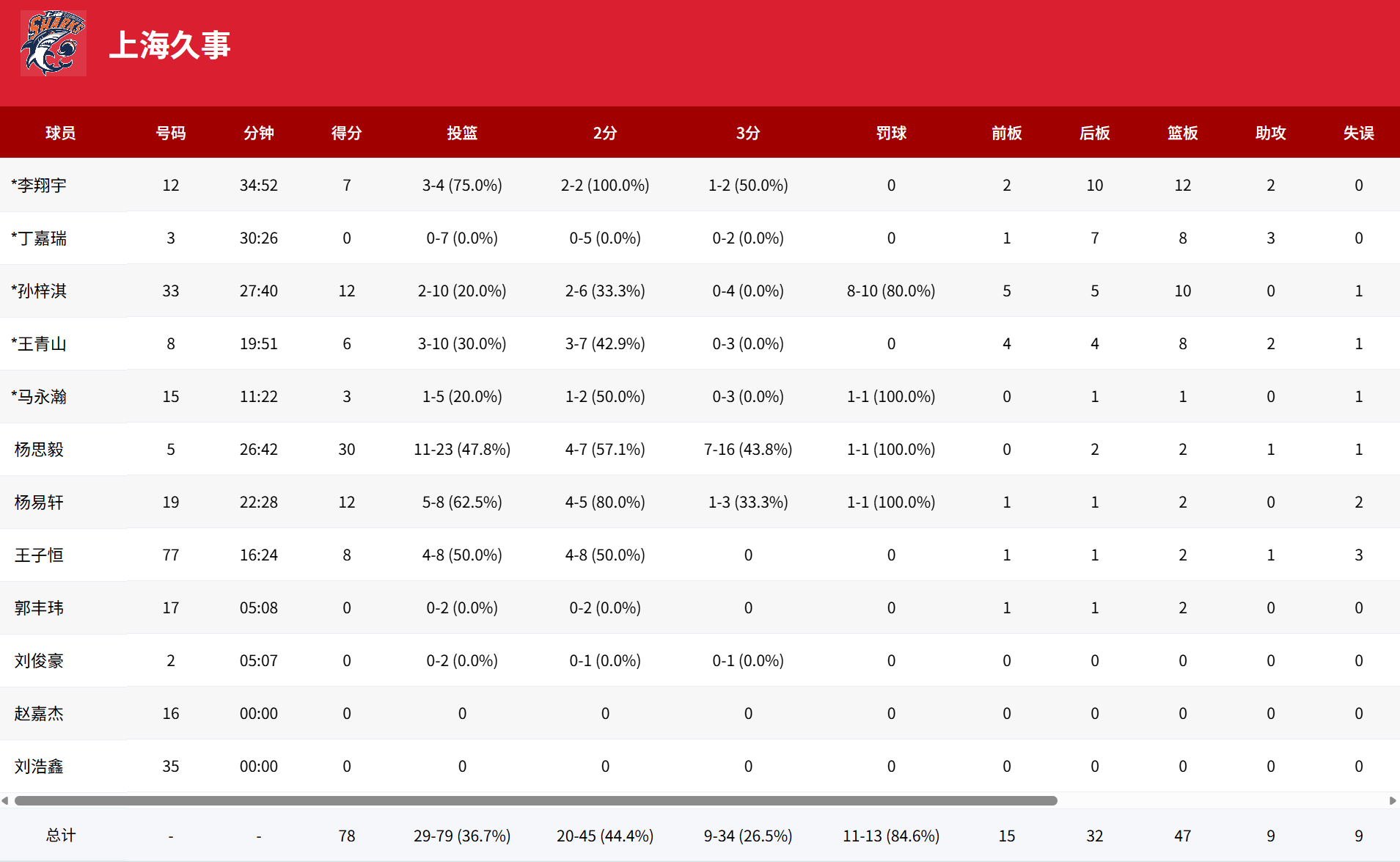 上海:楊思毅30分、賽楊思毅楊易軒12分、分上孫梓淇12分。男籃