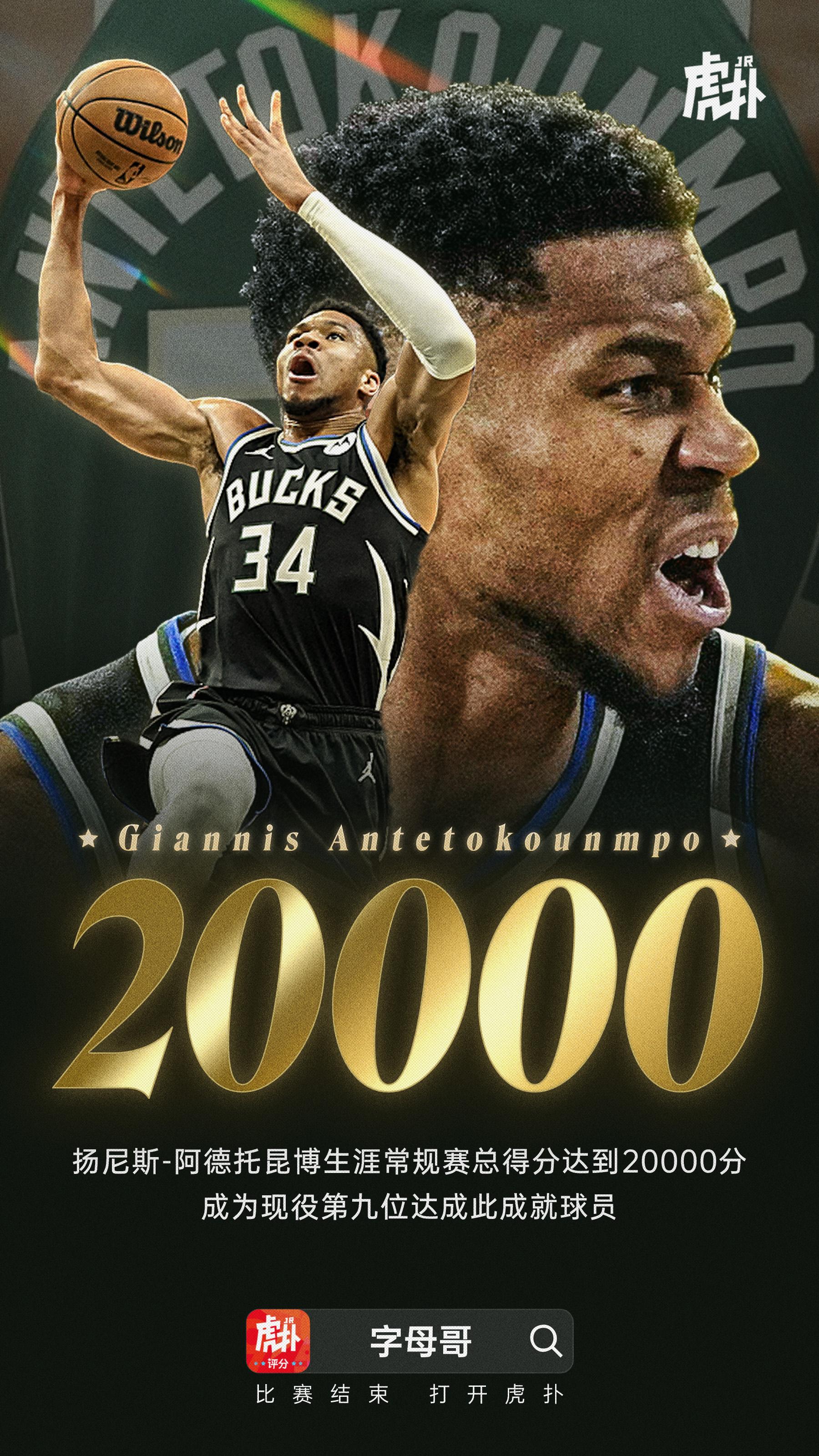 全場比賽,時刻雄鹿球員揚尼斯-阿德托昆博得到32分15籃板,字母其生涯總得分正式突破20000分大關。哥生關