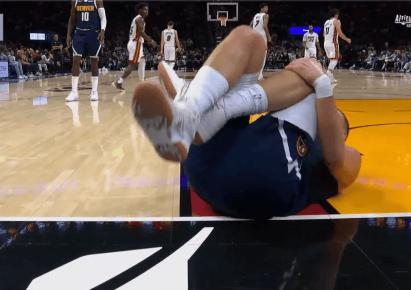 第二節(jié)比賽,約基奇被隊(duì)友意外踩到腳部痛苦倒地,隨后一瘸一拐走出球場。