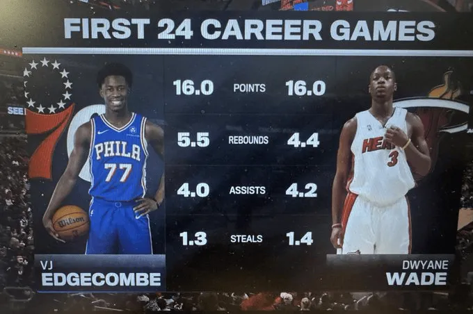 VJ-埃奇庫姆本賽季至今為76人出戰(zhàn)24場,場均可以得到16分5.5籃板4助攻,與韋德生涯同期的數(shù)據(jù)十分相似。