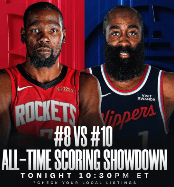賽前NBA官方曬出海報(bào)并寫(xiě)道:“凱文-杜蘭特(歷史得分榜第8位)將率領(lǐng)火箭前往洛杉磯,官方挑戰(zhàn)詹姆斯-哈登(歷史得分榜第10位)領(lǐng)銜的預(yù)熱快船?!?/p>