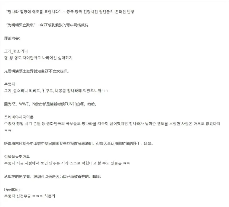 我買(mǎi)了全文看,后面有人說(shuō)清朝滅亡時(shí),漢族人大體上都認(rèn)同他屬于中華王朝,現(xiàn)在才來(lái)貶低說(shuō)是異族王朝,真是難看。估計(jì)是不想把清朝時(shí)期擴(kuò)張的領(lǐng)土吐出來(lái)吧。希望中國(guó)能回到明朝,不,回到春秋戰(zhàn)國(guó)時(shí)代韓國(guó)的領(lǐng)土水平就好……反正大致都是這種評(píng)論,不能多說(shuō)了,有興趣的可以自己去看一下。