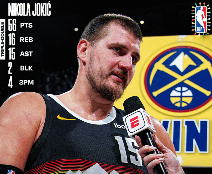 1. 約基奇成為歷史上第一位拿到55分15籃板15助攻的球員