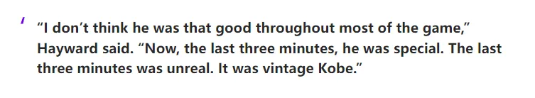 “但我要說的是,我們在比賽的大部分時間內(nèi)都取得穩(wěn)健的領(lǐng)先,他可能投了六七次空氣球。他出手了50次。我不認(rèn)為他在比賽的絕大多數(shù)時間里都表現(xiàn)得那么好?,F(xiàn)在,說到最后三分鐘,他很特別。最后三分鐘是不真實的。那是科比的經(jīng)典之作?!焙N值抡f。