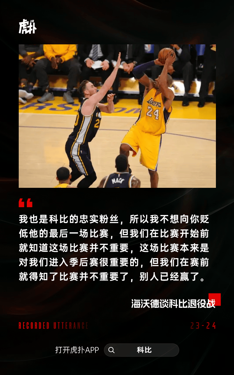 “我也是科比的忠實粉絲,所以我不想向你貶低他的最后一場比賽,但我們在比賽開始前就知道這場比賽并不重要,這場比賽本來是對我們進(jìn)入季后賽很重要的,但我們在賽前就得知了比賽并不重要了,別人已經(jīng)贏了。”海沃德說。