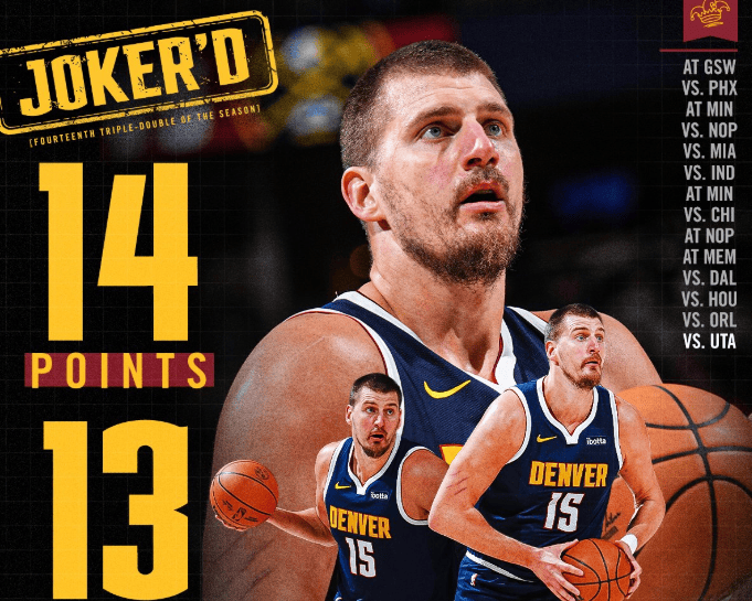 [流言板]三雙機器!約基奇本賽季出戰(zhàn)28場比賽,已經(jīng)14場拿到三雙