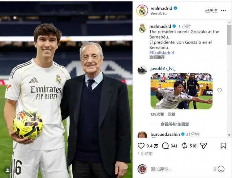 皇馬主席弗洛倫蒂諾賽后與貢薩洛·加西亞合影,貢薩祝賀后者上演帽子戲法,影祝員上演帽皇馬官方社媒曬出照片。戲法