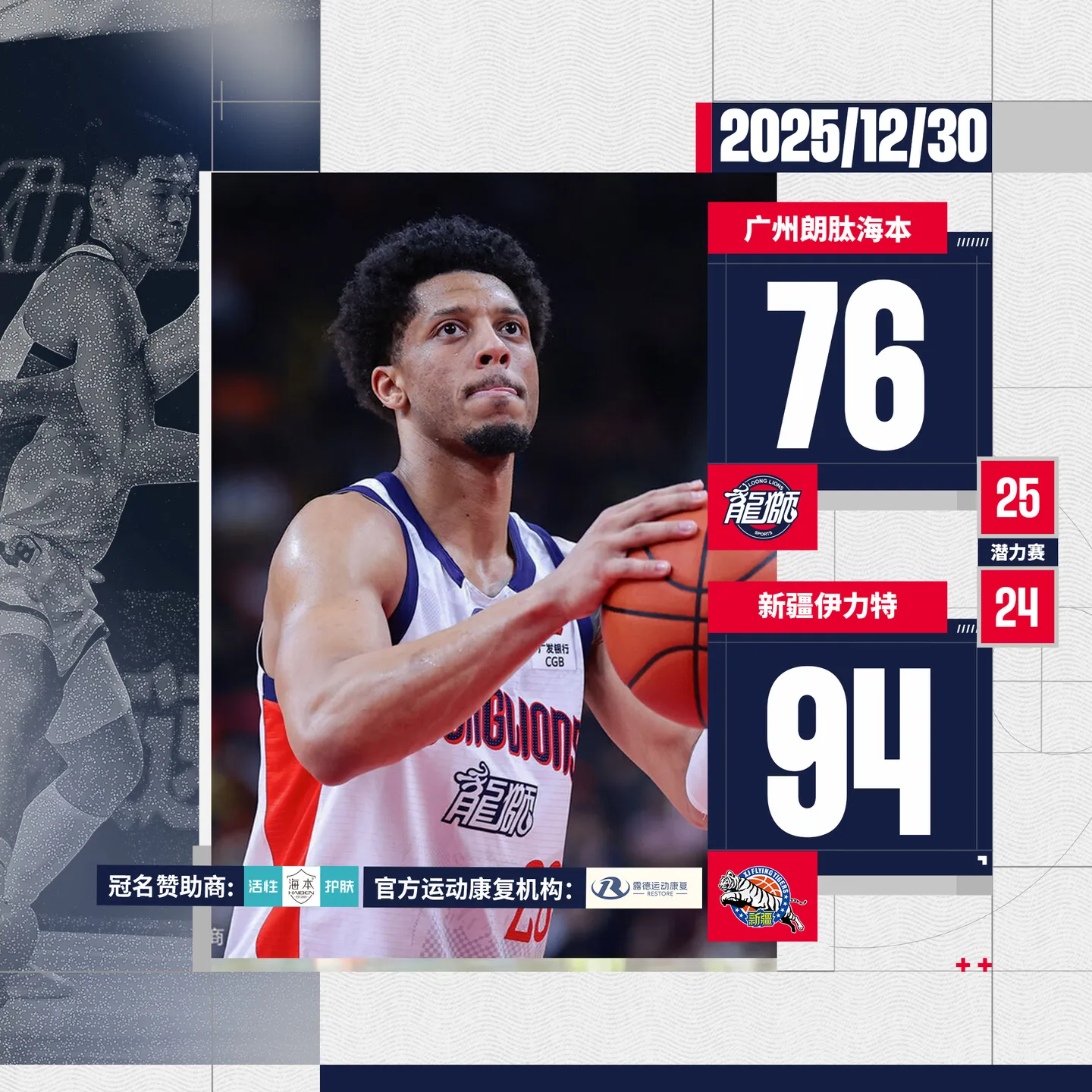 賽后,州男廣州男籃社媒分享比賽海報(bào):球隊(duì)客場76-94不敵新疆男籃。媒分