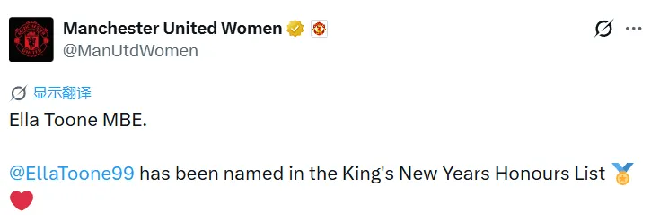 官方:曼聯(lián)女足隊員埃拉?圖恩入選2026年新年授勛名單,將獲頒大英帝國員佐勛章(MBE)。