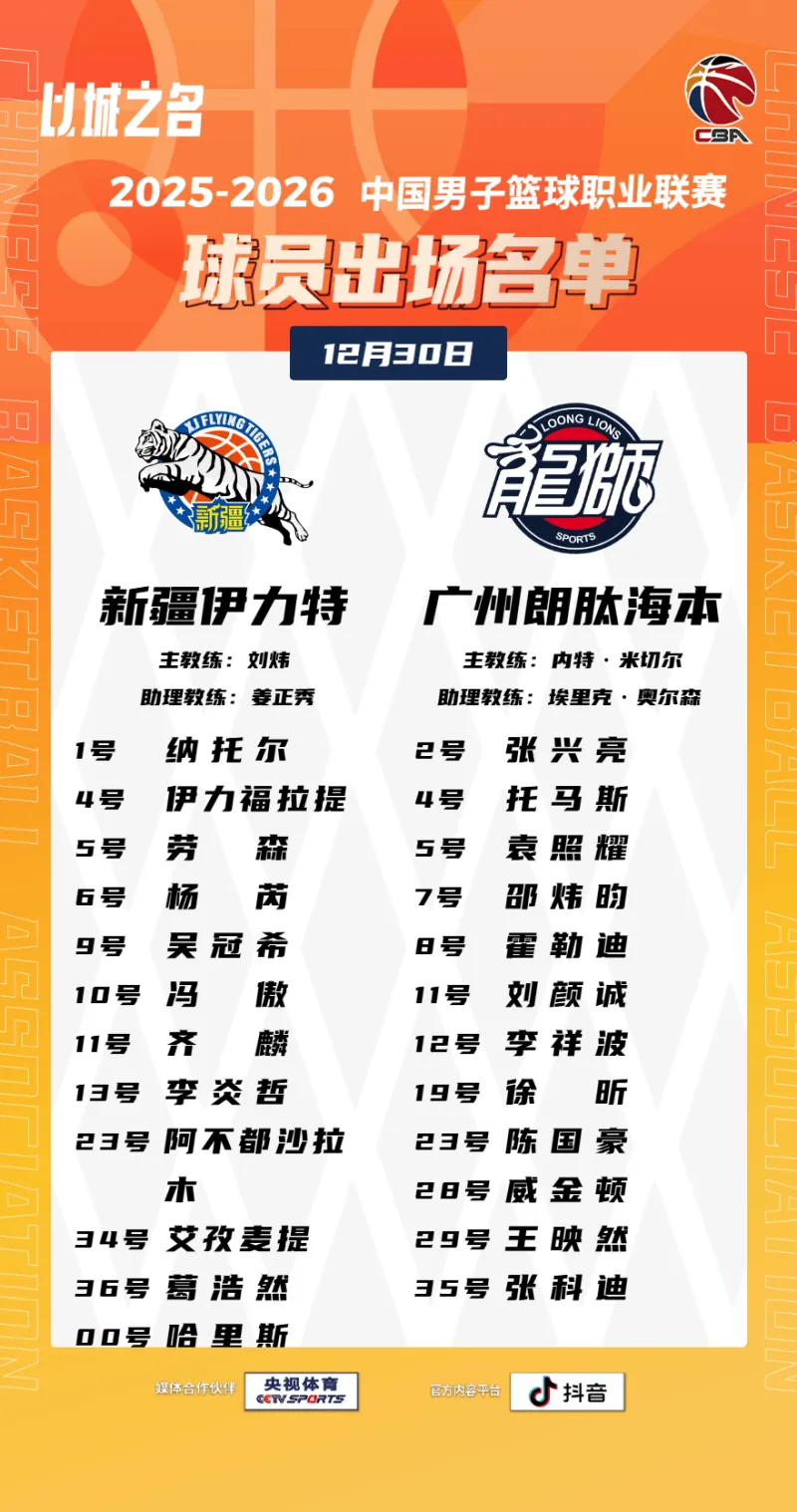 虎撲12月30日訊 今晚CBA常規(guī)賽,新疆對陣廣州的州大哲出戰(zhàn)陳大名單已經公布。