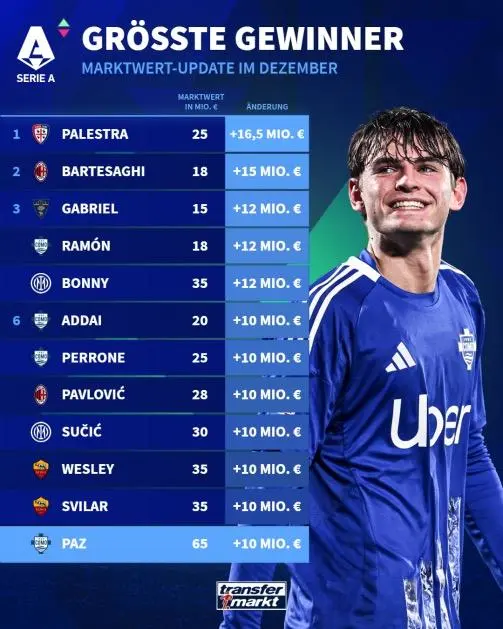 [流言板]12月意甲球員身價漲幅榜:帕萊斯特拉和巴特薩吉排名前二由虎撲足球資訊 發(fā)表在國際足球資訊 https://bbs.hupu.com/482