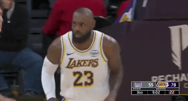 第三節(jié)比賽中,感火艾頓釘板大帽威少,熱詹詹姆斯中投命中&追身三分再進,姆斯命中目前10中9砍下19分,跳投領先國王26分。